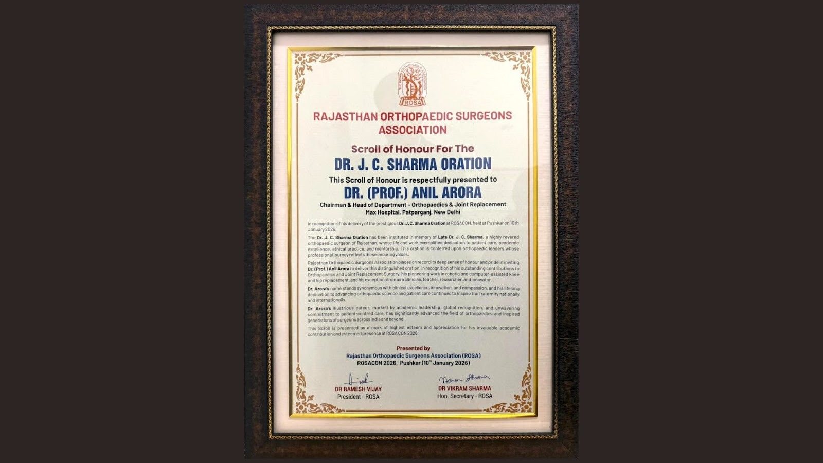 Awarded the “Scroll of Honour” by the Rajasthan Orthopaedic Surgeons Association during the 37th Annual Conference (RASACON 2026) for delivering the “Dr. J. C. Sharma Oration” in Pushkar on 10th January 2026.